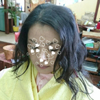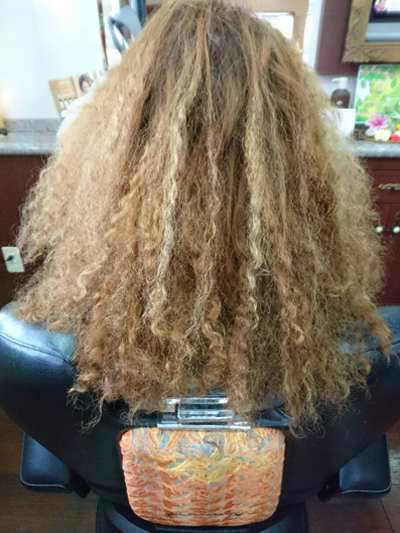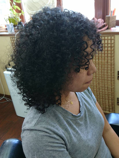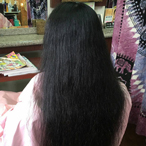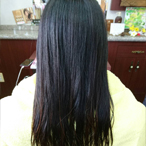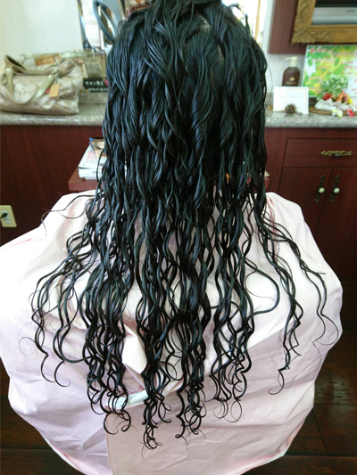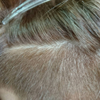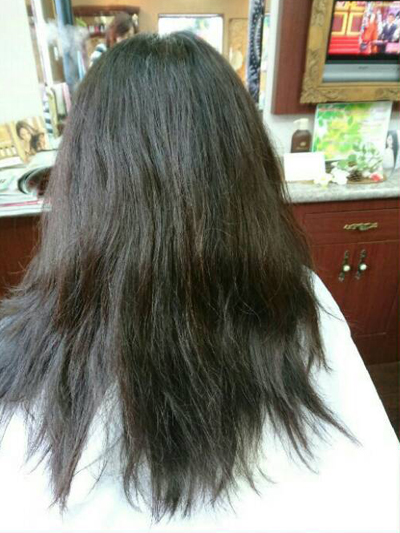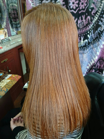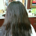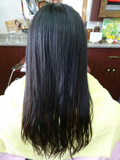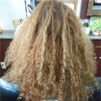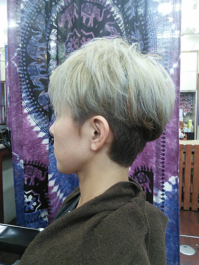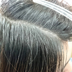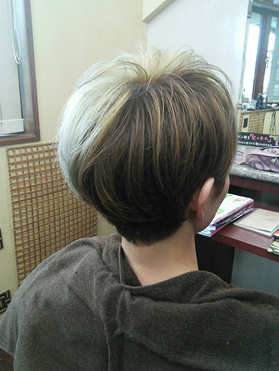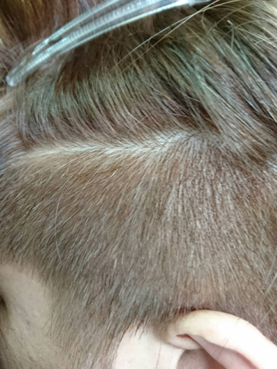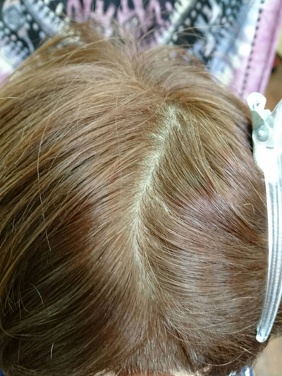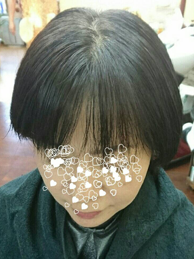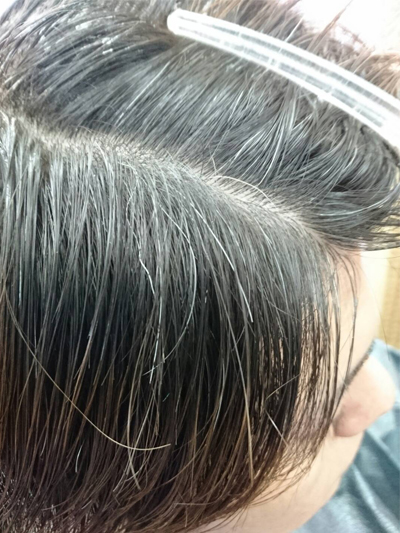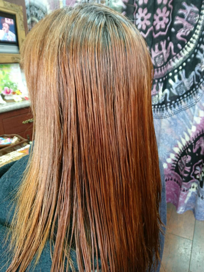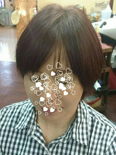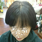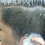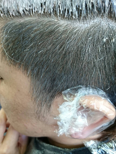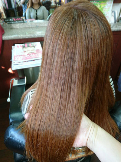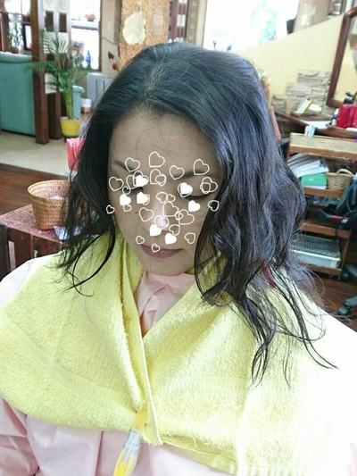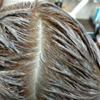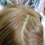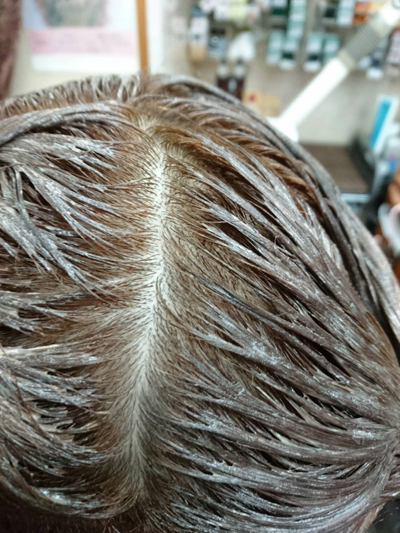 | ダメージのもっとも少ない酸性脱色剤で、白髪染めの色素を抜きます | 脱染後、イチゴカラーを全体に塗って、白髪をカバーしていきます | イチゴカラー後 明るさ重視のイチゴカラー |